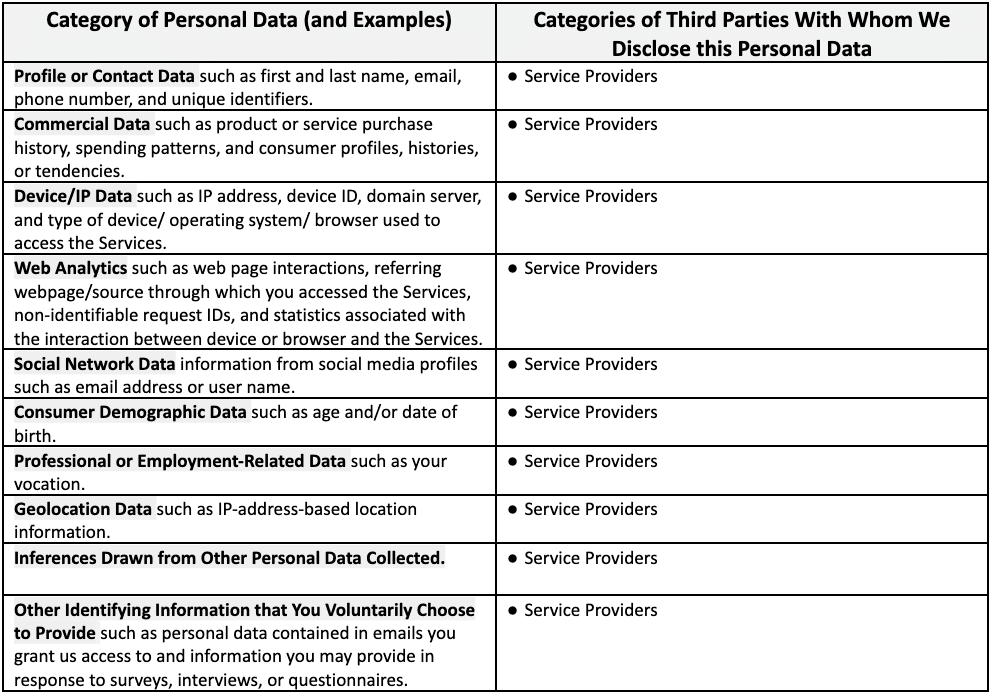 We disclose your Personal Data to the categories of service providers and other parties listed in this section. Depending on state laws that may be applicable to you, some of these disclosures may constitute a “sale” of your Personal Data. For more information, please refer to the state-specific sections below.